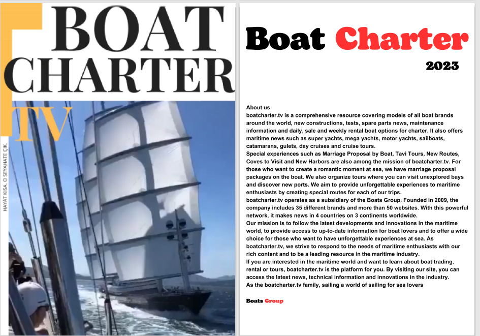 We broadcast your products and services to a wide audience through 19 local Turkish and 51 international English-language web platforms. Whether it’s rental and sale of boats, sailboats, motor yachts, catamarans, inflatable boats, or marine engines, we promote your offerings globally. Additionally, we amplify your news on boat and yacht materials with highly effective SEO-focused content.