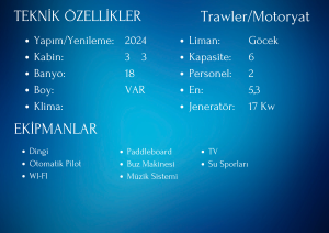 2024 yılında inşa edilen, 18 metre uzunluğundaki Kaan Bey Trawler/Motoryat, deniz tutkunlarına Göcek’in eşsiz koylarında unutulmaz bir mavi yolculuk deneyimi sunuyor. 3 kabini ve 6 kişi konaklama kapasitesiyle, bu lüks motoryat tatilinizi hem konforlu hem de keyifli bir hale getirmek için tasarlandı.